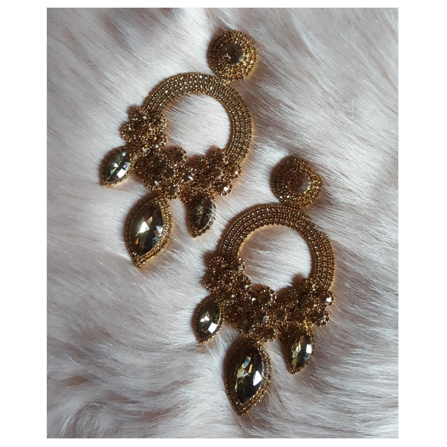 The ultimate show stopper chandelier earrings. Gold with smoke colored rhinestones. Hangs about 5 1/2 inches in length. Post back. Nickle and lead compliant.